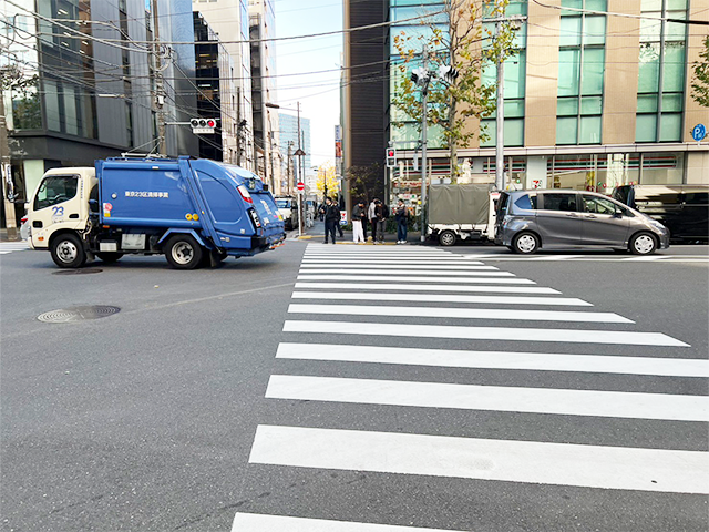 BIG APPLEがある交差点の信号を渡りすぐ右の信号を渡ります。
